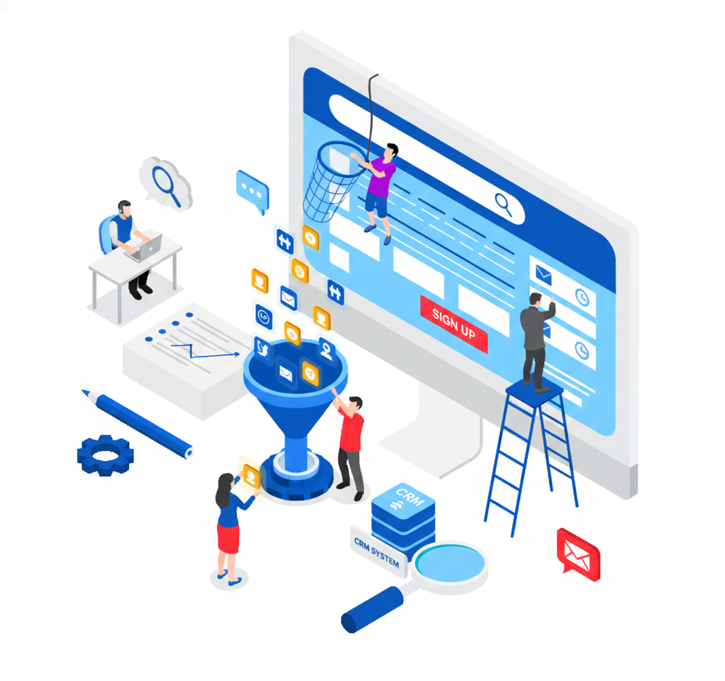 - Multi-touchpoint funnel: ads, landing pages, email, calls.